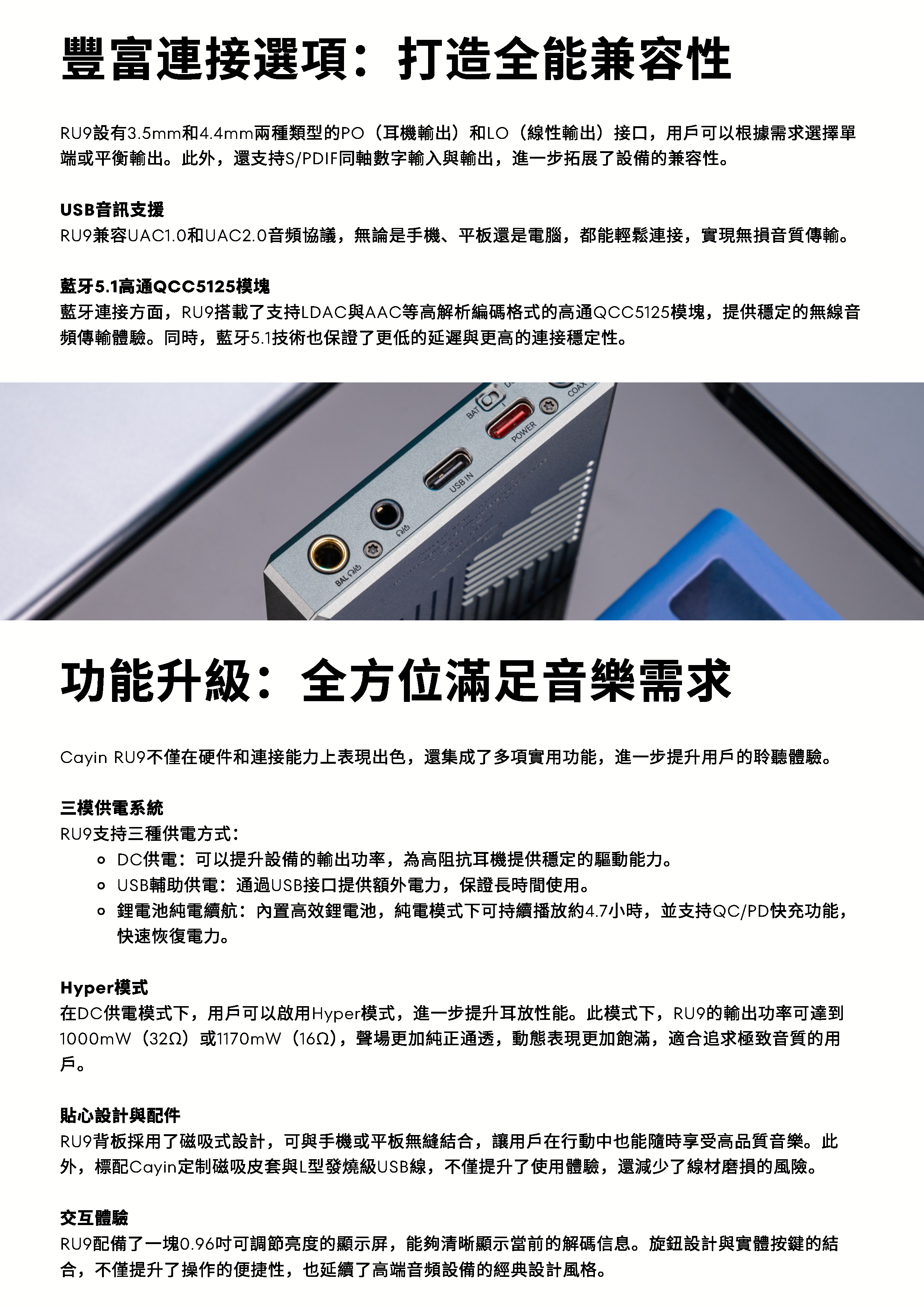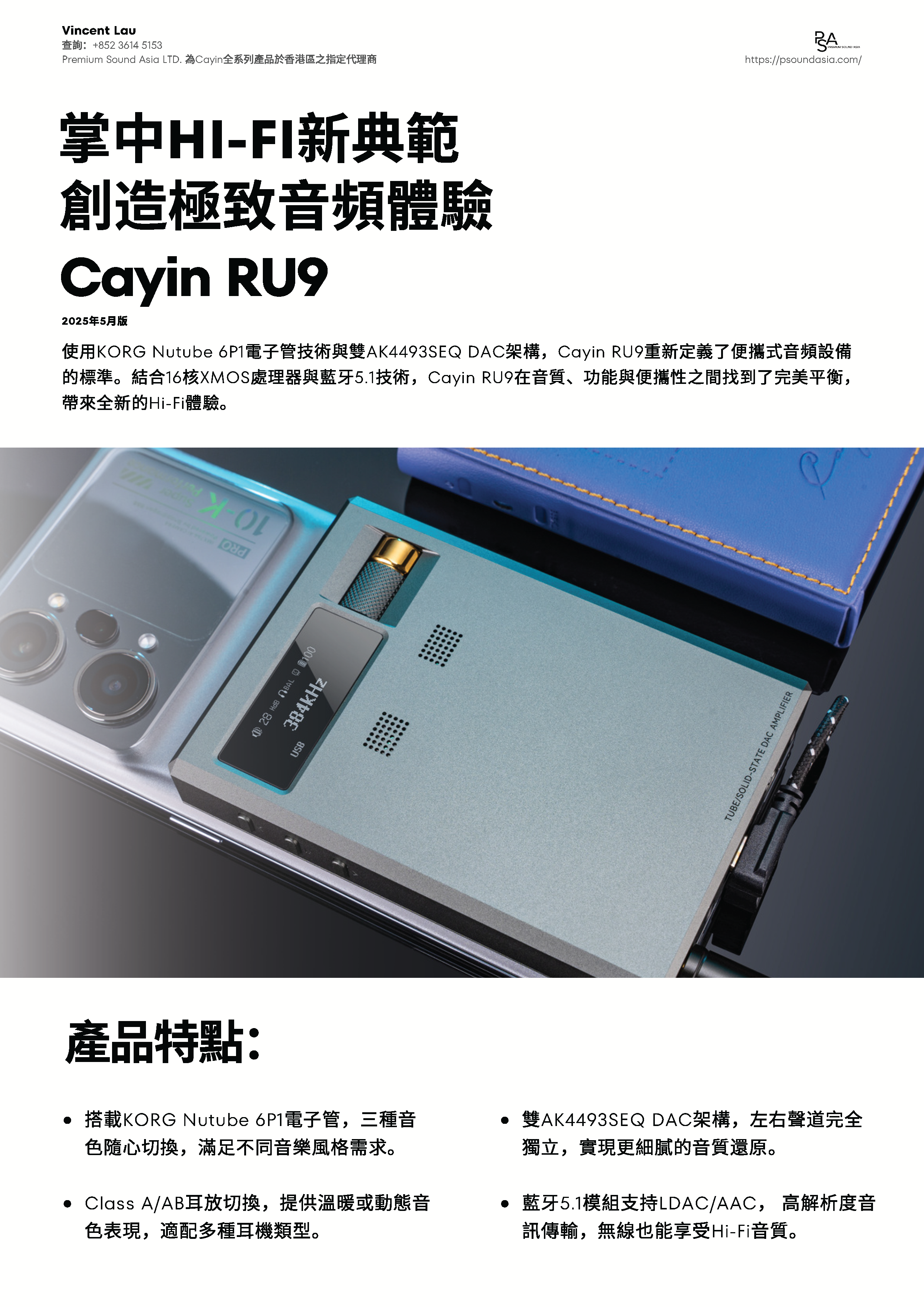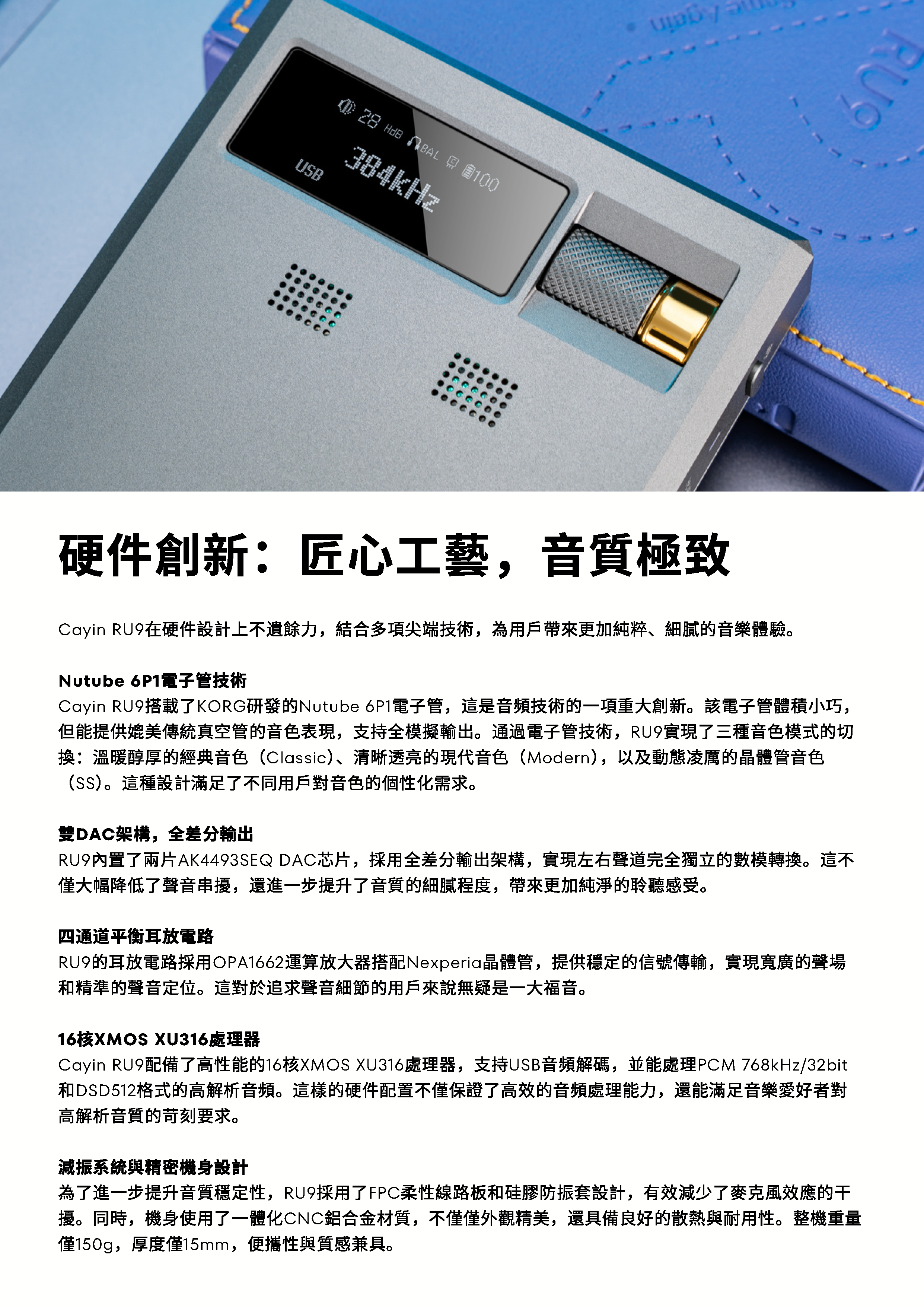 Cayin RU9使用KORG Nutube 6P1電子管技術與雙AK4493SEQ DAC架構,Cayin RU9重新定義了便攜式音頻設備的標準。結合16核XMOS處理器與藍牙5.1技術,Cayin RU9在音質、功能與便攜性之間找到了完美平衡,帶來全新的Hi-Fi體驗。