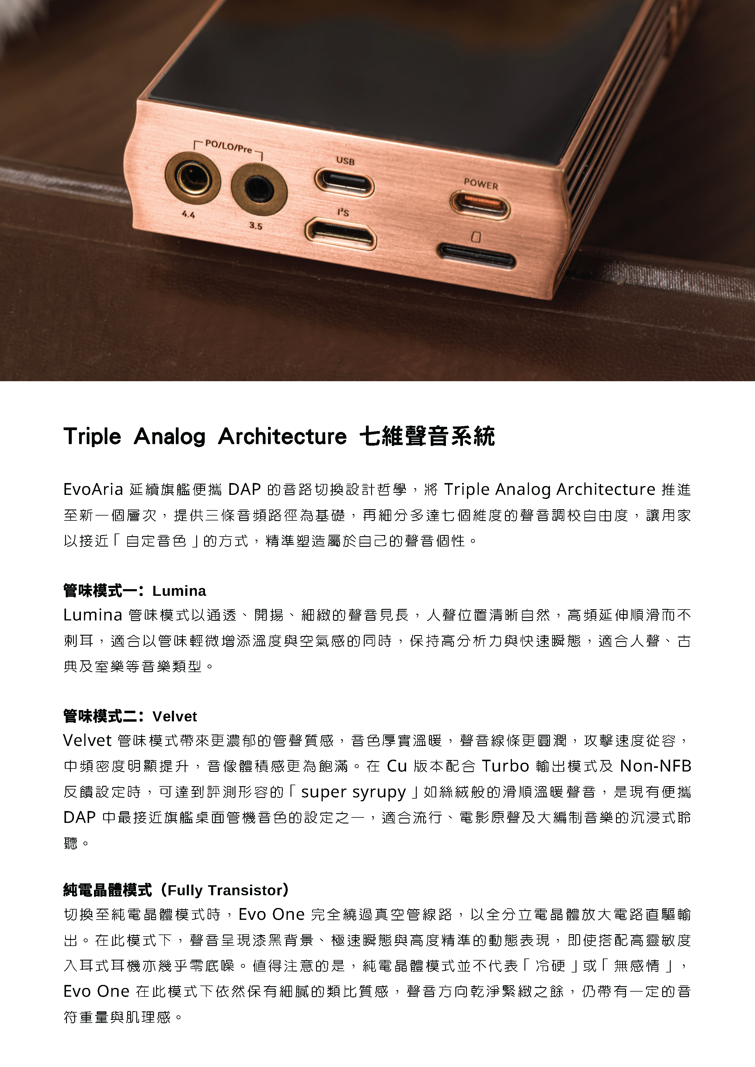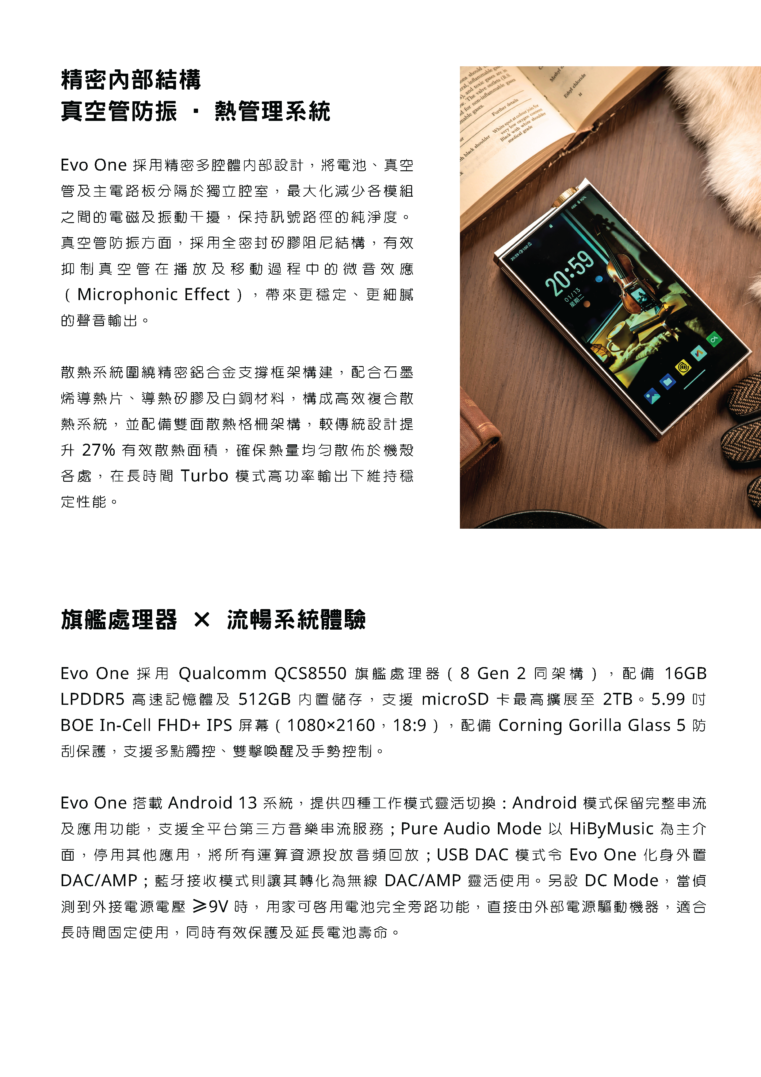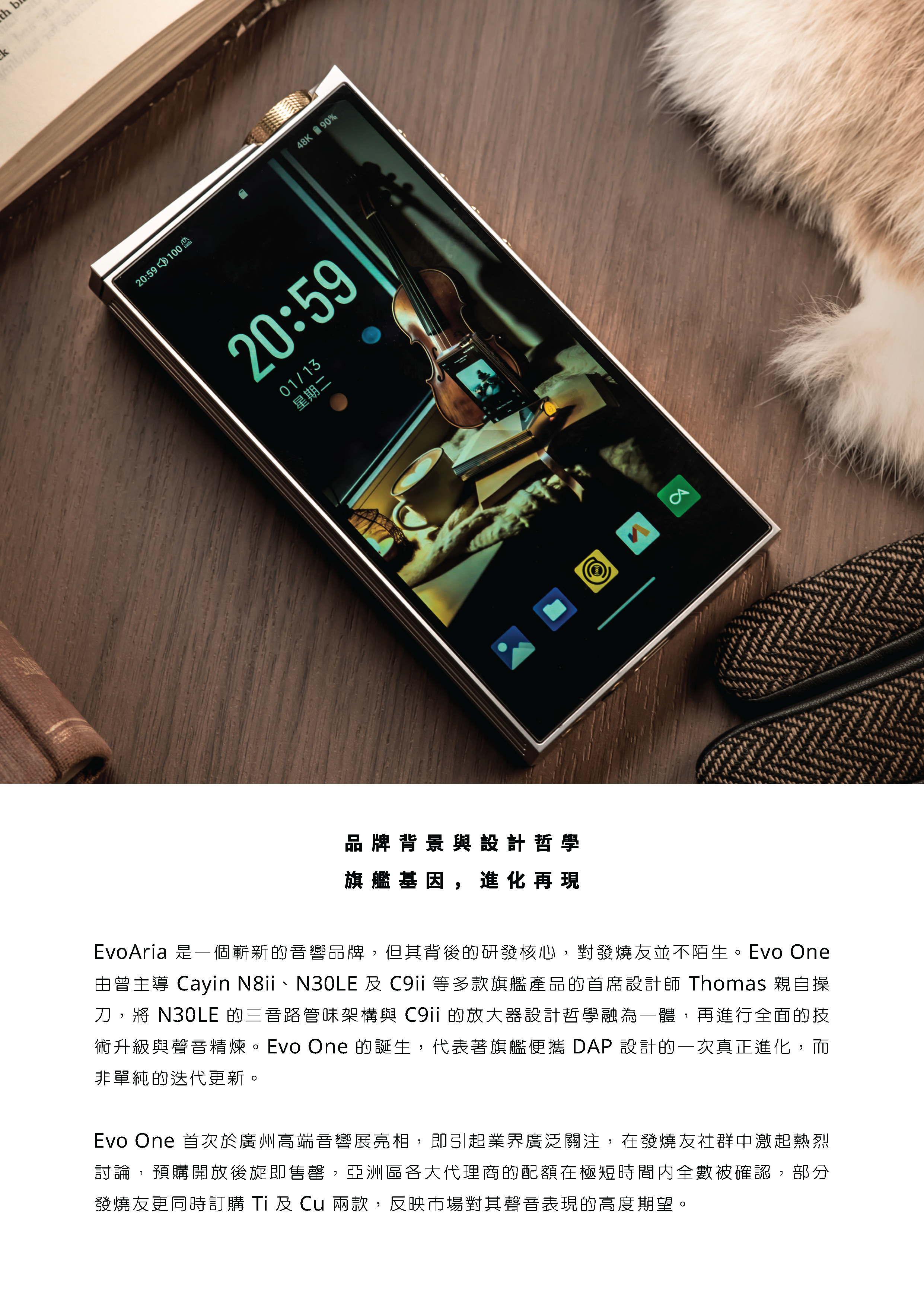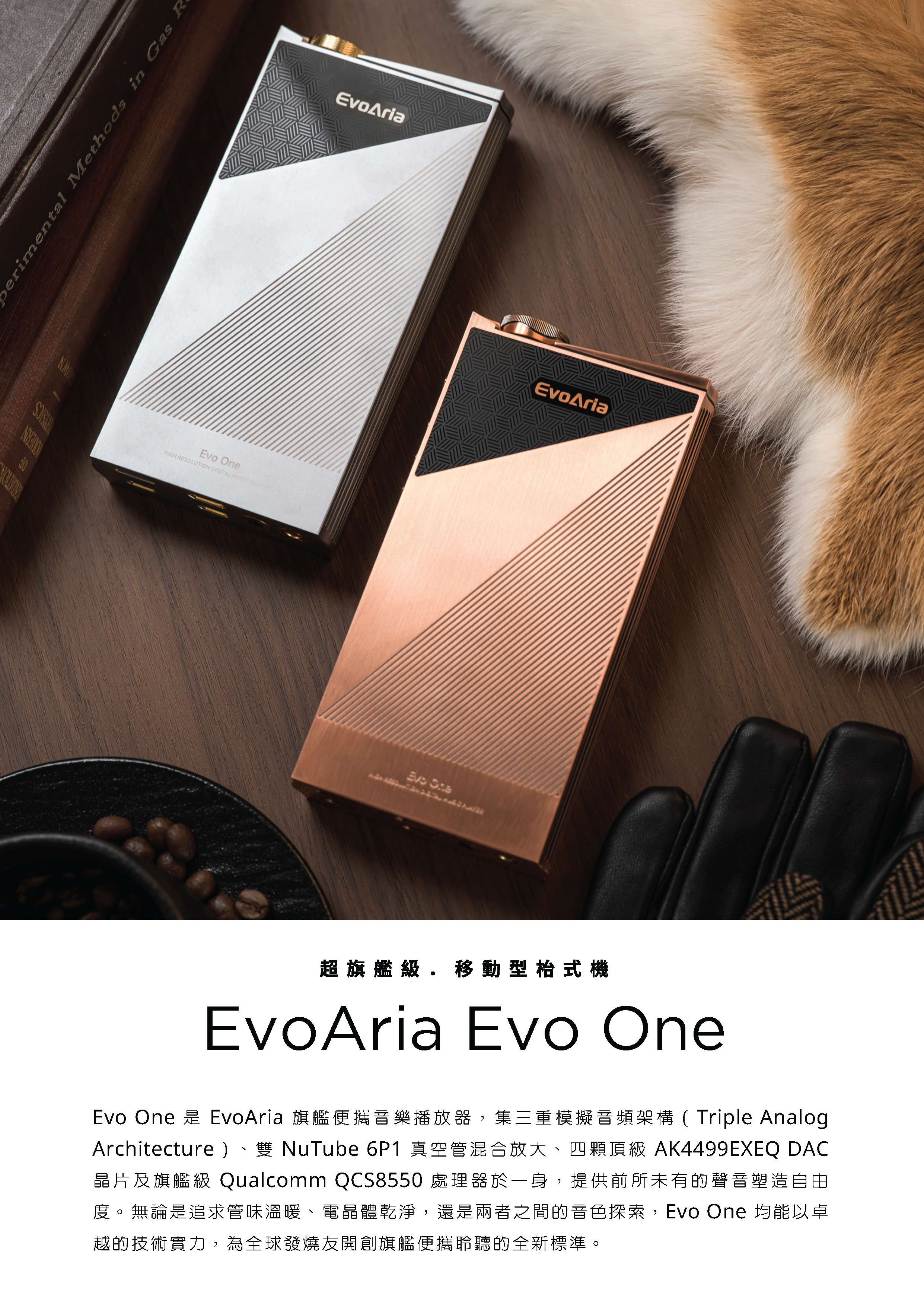 Evo One 是 EvoAria 旗艦便攜音樂播放器,集三重模擬音頻架構(Triple Analog Architecture)、雙 NuTube 6P1 真空管混合放大、四顆頂級 AK4499EXEQ DAC 晶片及旗艦級 Qualcomm QCS8550 處理器於一身,提供前所未有的聲音塑造自由 度。無論是追求管味溫暖、電晶體乾淨,還是兩者之間的音色探索,Evo One 均能以卓 越的技術實力,為全球發燒友開創旗艦便攜聆聽的全新標準。
