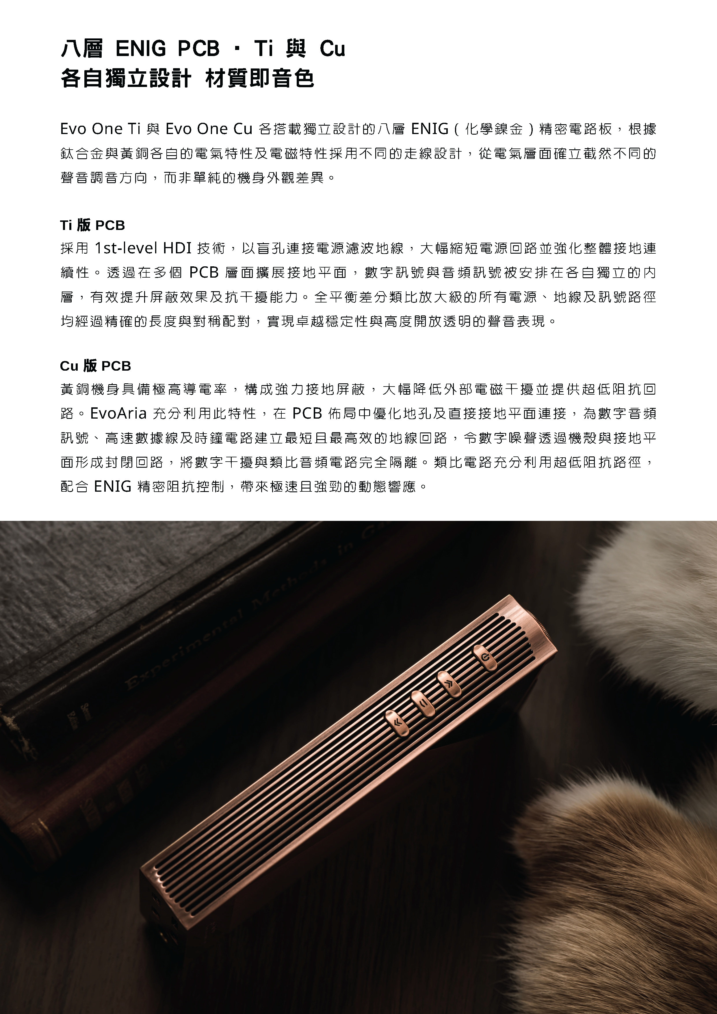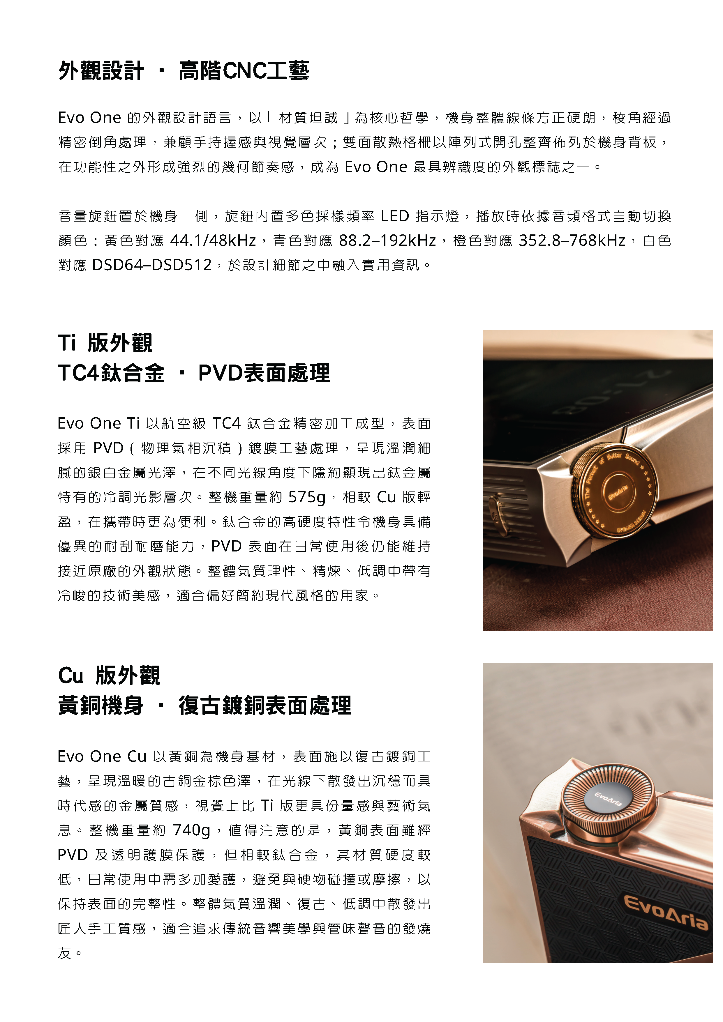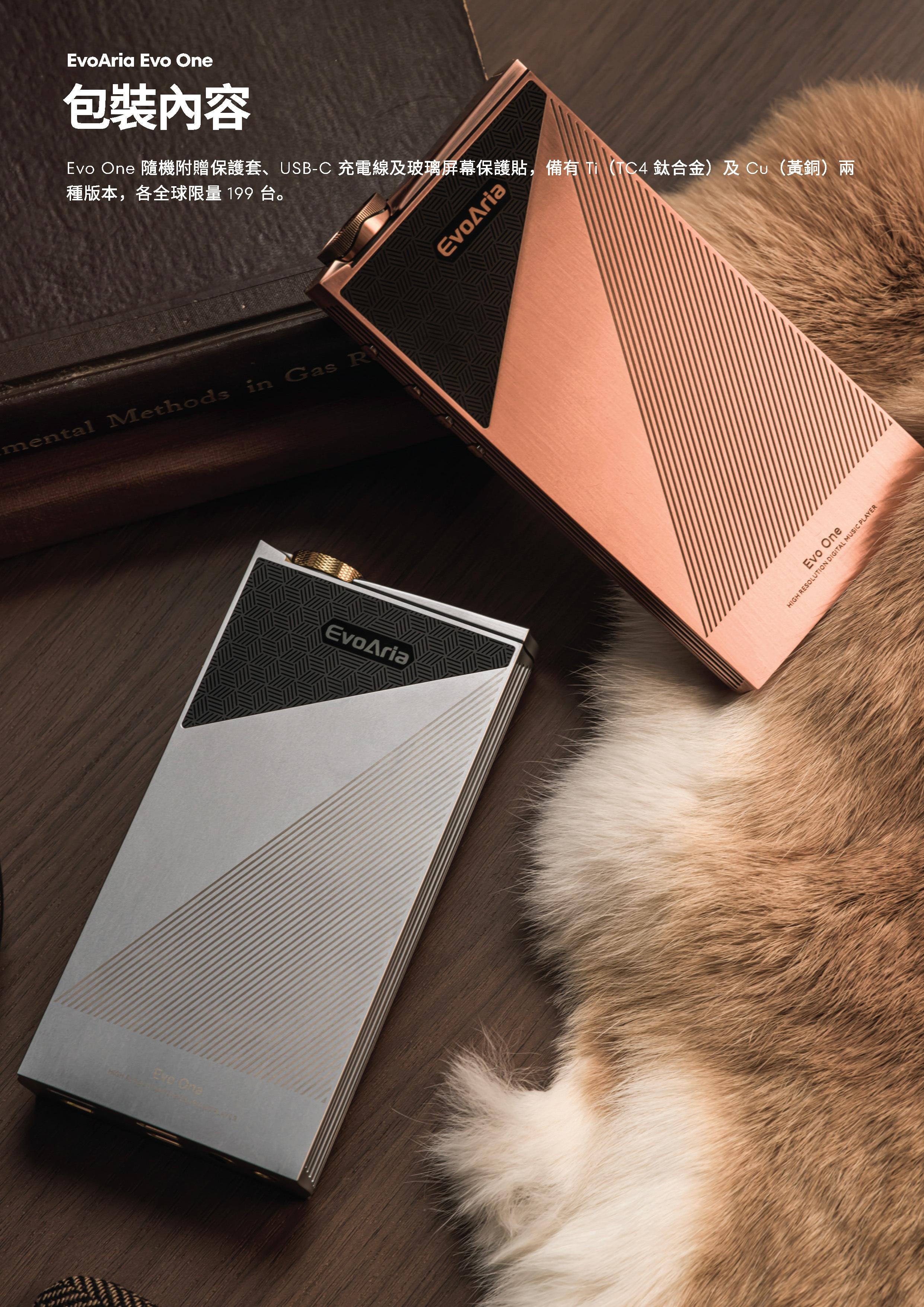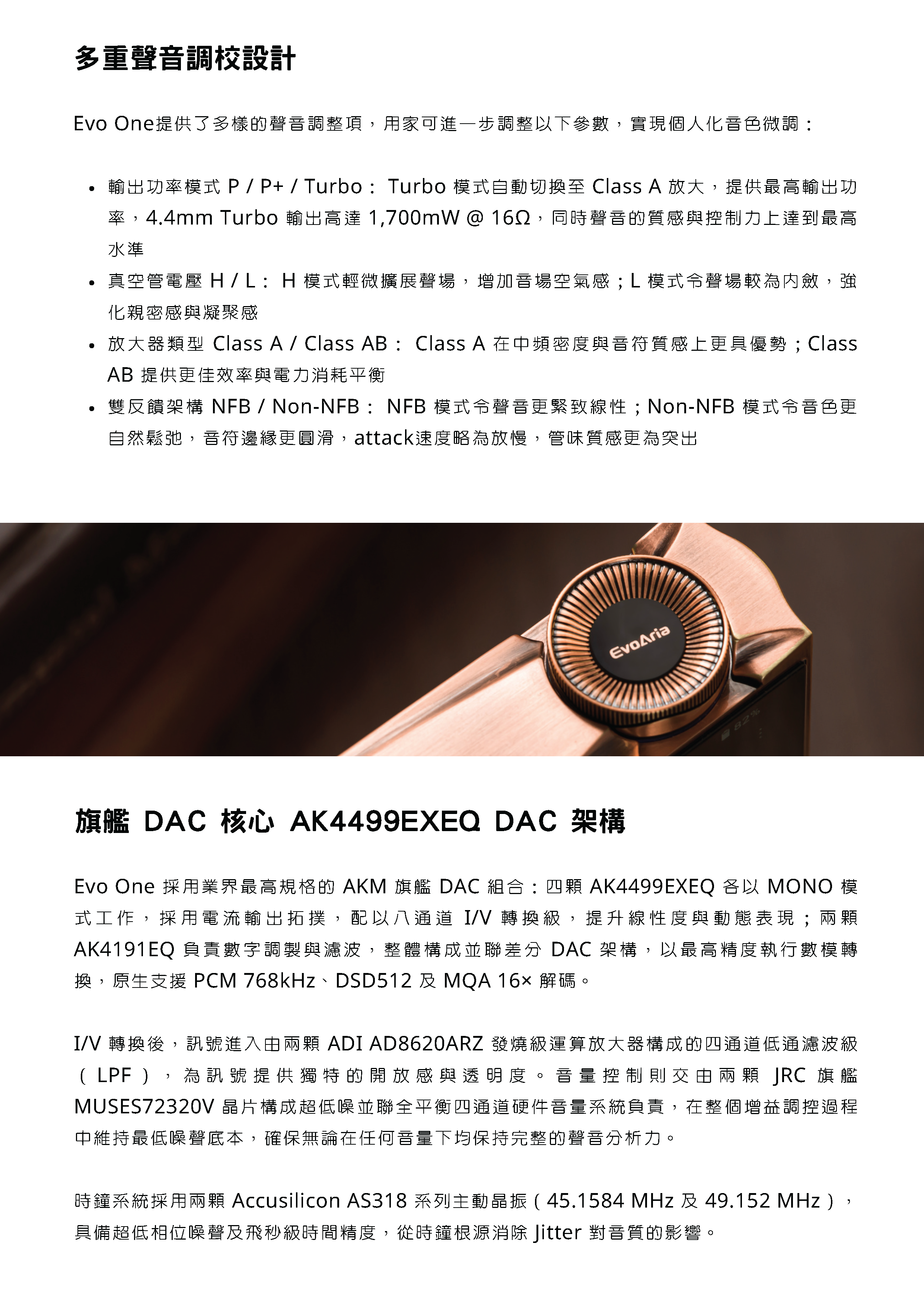 Evo One 是 EvoAria 旗艦便攜音樂播放器,集三重模擬音頻架構(Triple Analog Architecture)、雙 NuTube 6P1 真空管混合放大、四顆頂級 AK4499EXEQ DAC 晶片及旗艦級 Qualcomm QCS8550 處理器於一身,提供前所未有的聲音塑造自由 度。無論是追求管味溫暖、電晶體乾淨,還是兩者之間的音色探索,Evo One 均能以卓 越的技術實力,為全球發燒友開創旗艦便攜聆聽的全新標準。