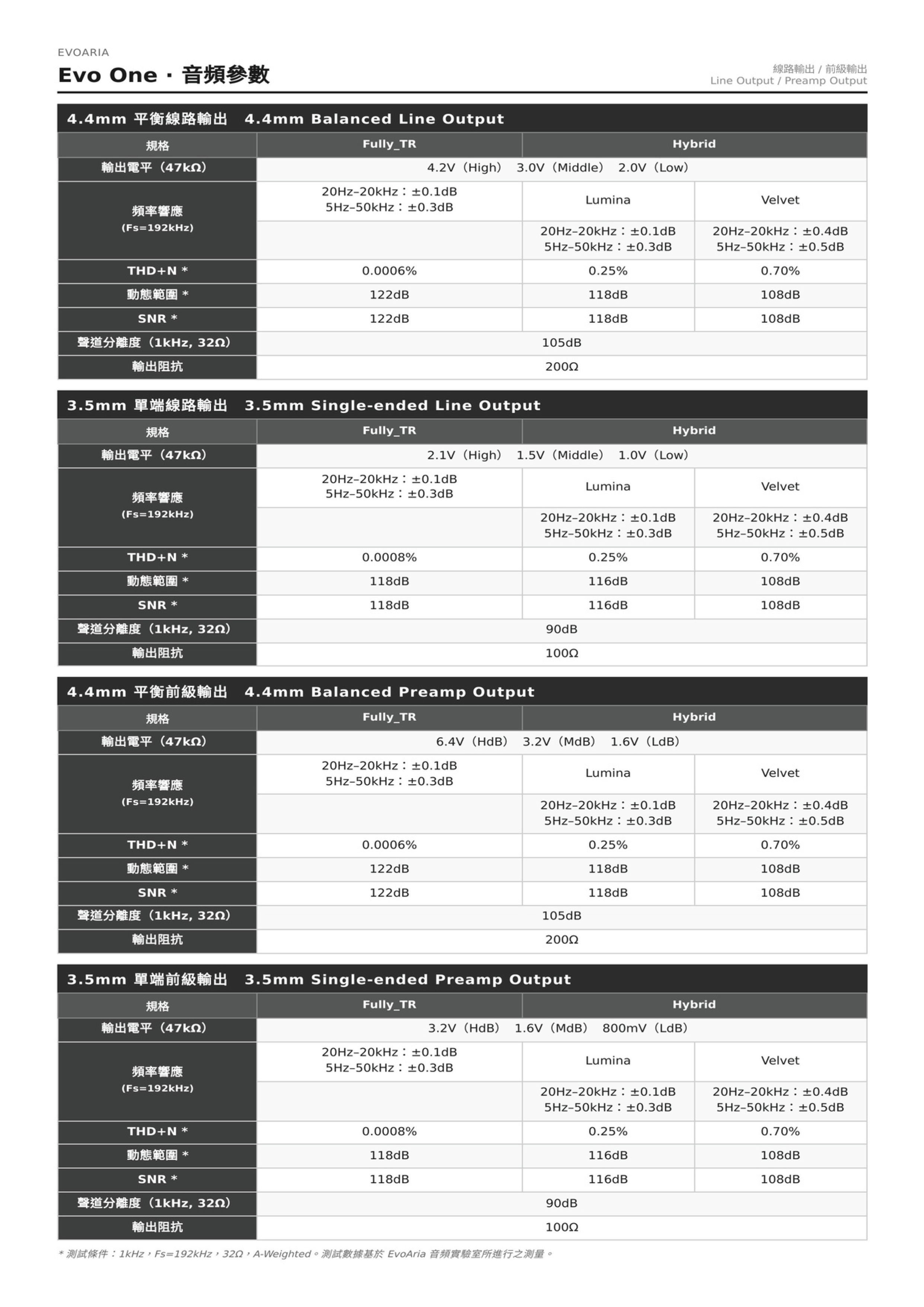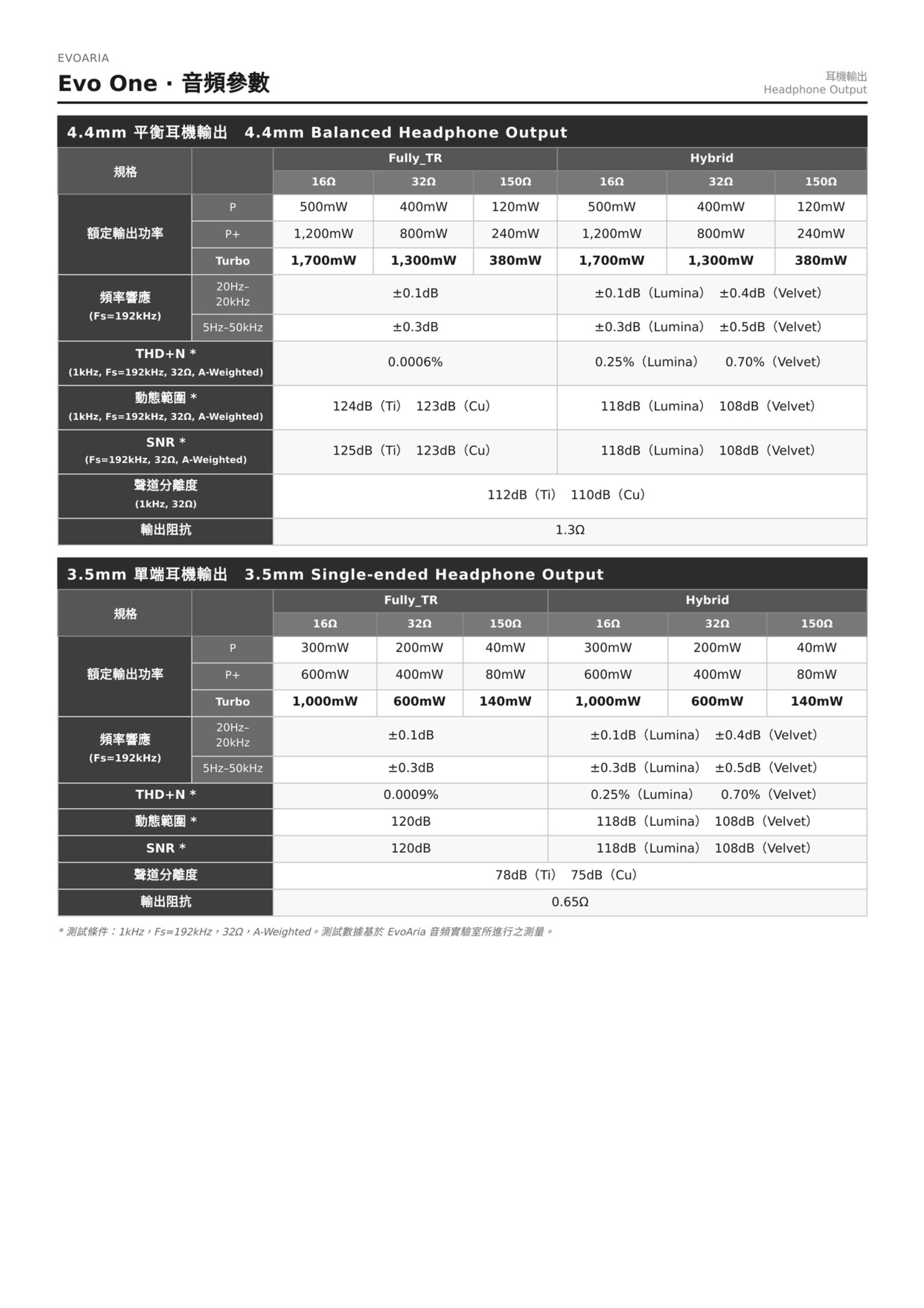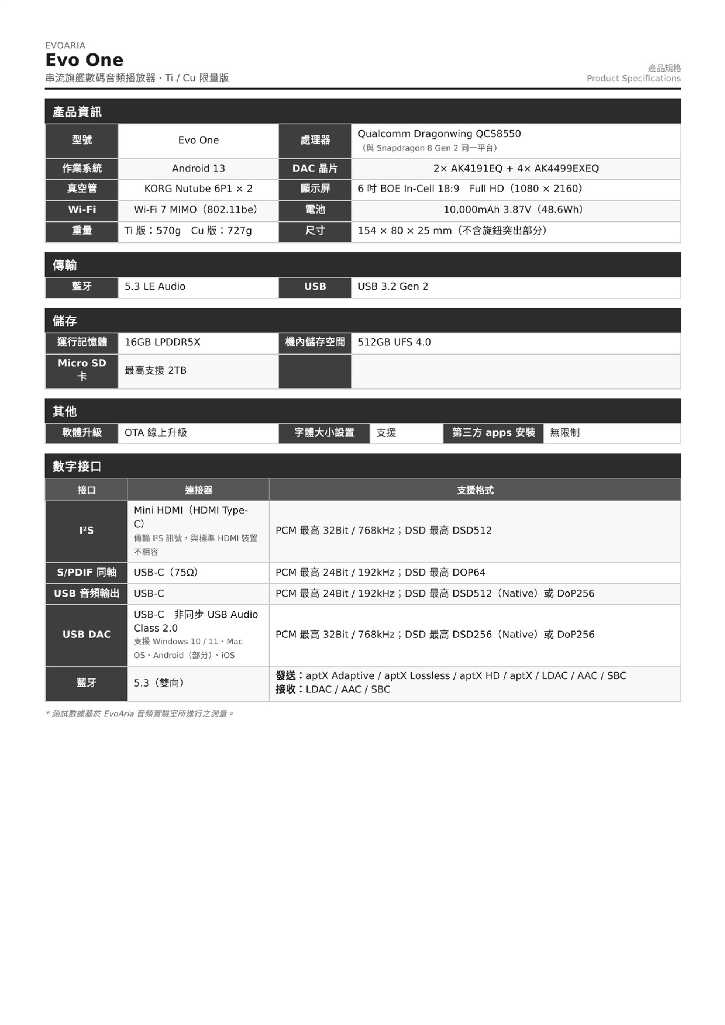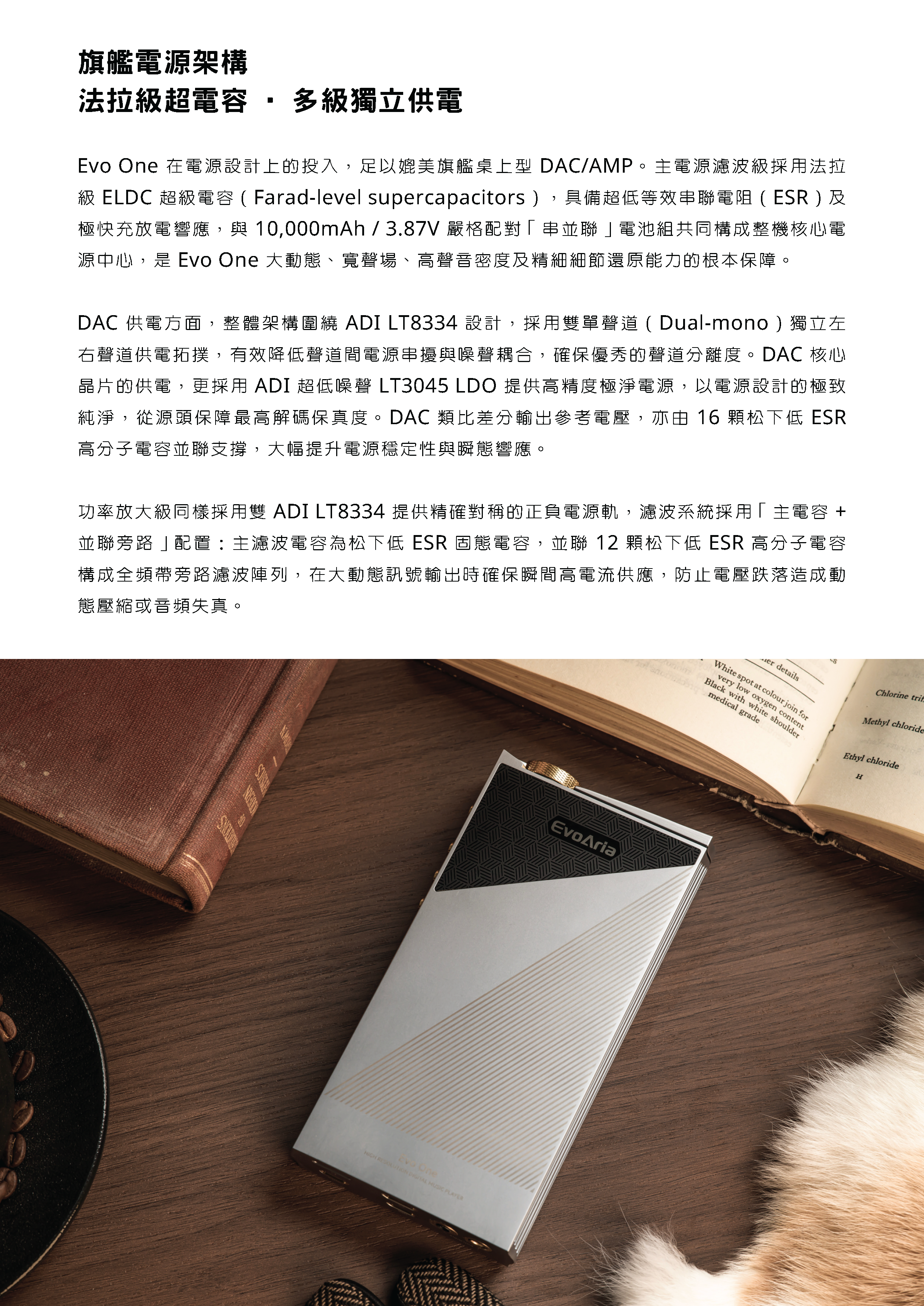Evo One 是 EvoAria 旗艦便攜音樂播放器,集三重模擬音頻架構(Triple Analog Architecture)、雙 NuTube 6P1 真空管混合放大、四顆頂級 AK4499EXEQ DAC 晶片及旗艦級 Qualcomm QCS8550 處理器於一身,提供前所未有的聲音塑造自由 度。無論是追求管味溫暖、電晶體乾淨,還是兩者之間的音色探索,Evo One 均能以卓 越的技術實力,為全球發燒友開創旗艦便攜聆聽的全新標準。