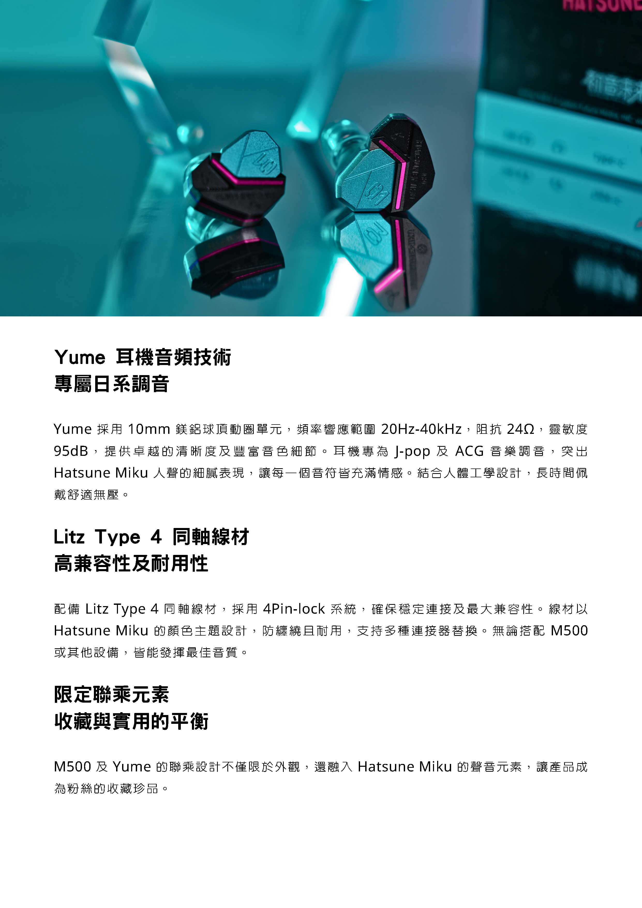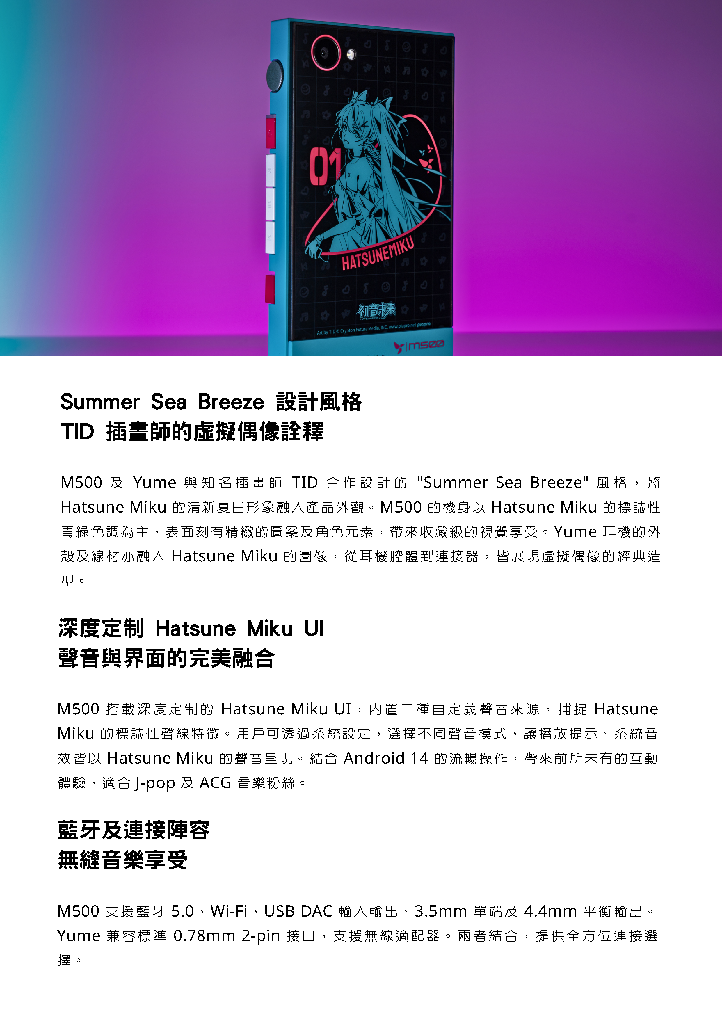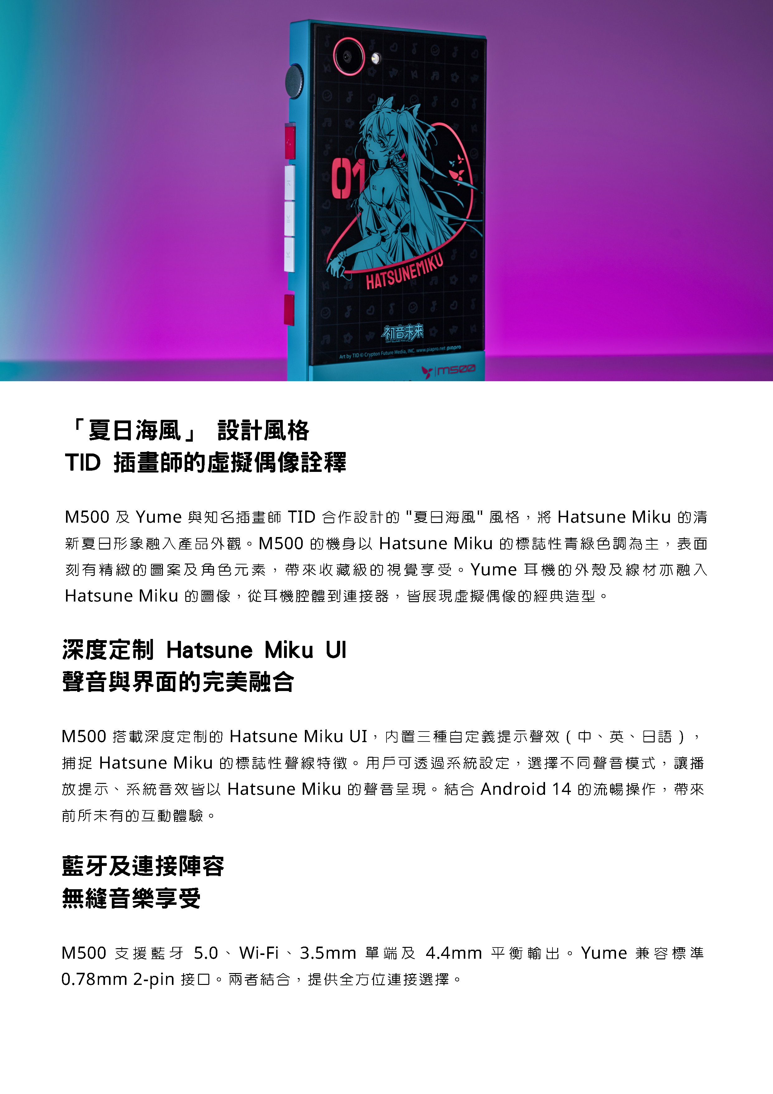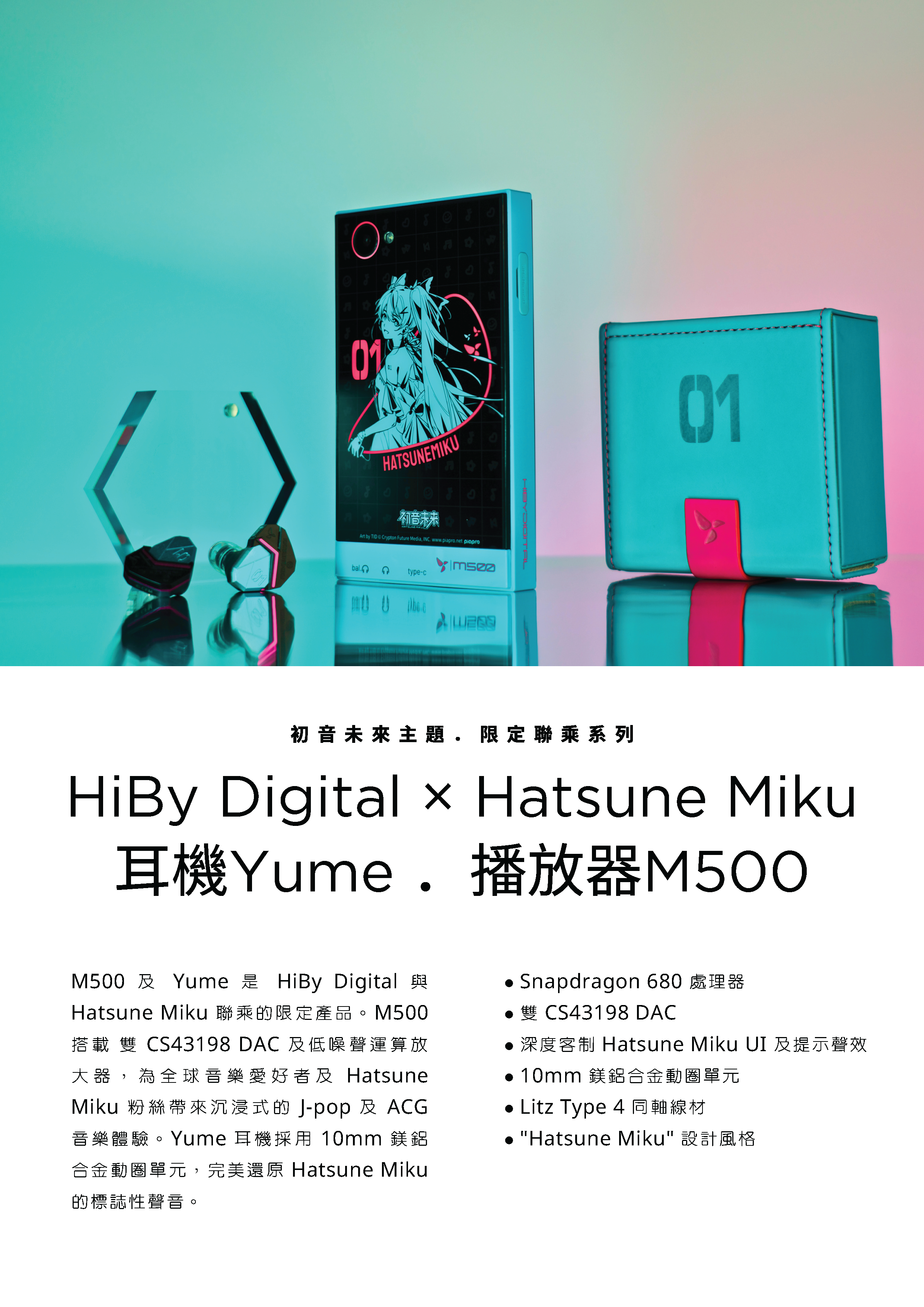 M500 及 Yume 是 HiBy Digital 與 Hatsune Miku 聯乘的限定產品。M500 搭載 雙 CS43198 DAC 及低噪聲運算放 大器, 為全球音樂愛好者及 Hatsune Miku 粉絲帶來沉浸式的 J-pop 及 ACG 音樂體驗。Yume 耳機採用 10mm 鎂鋁 合金動圈單元,完美還原 Hatsune Miku 的標誌性聲音。