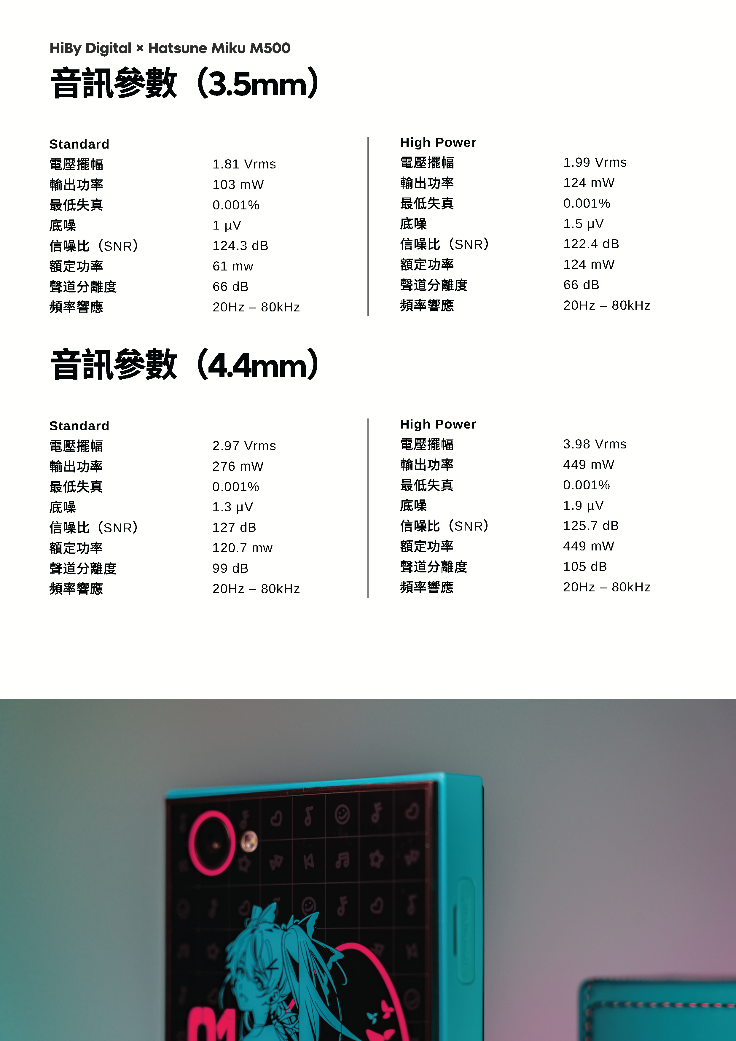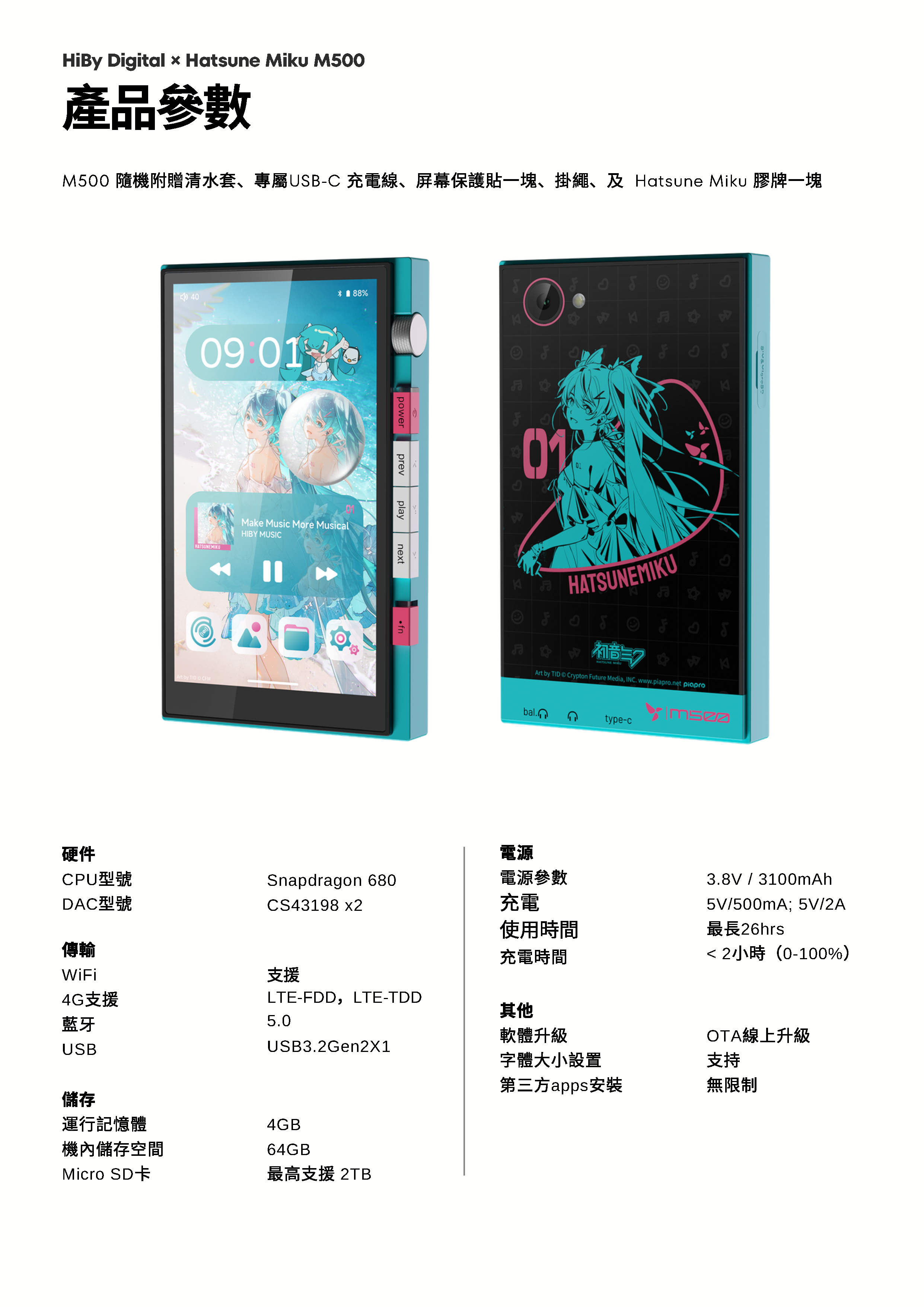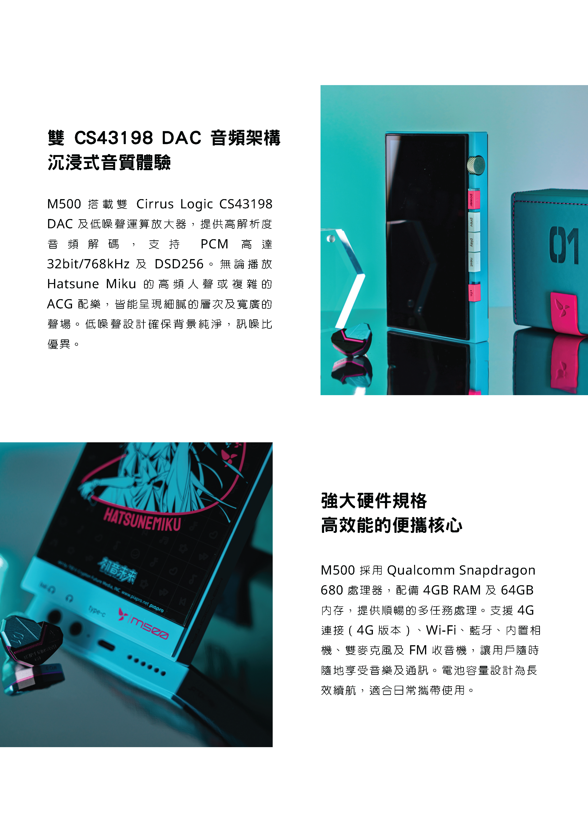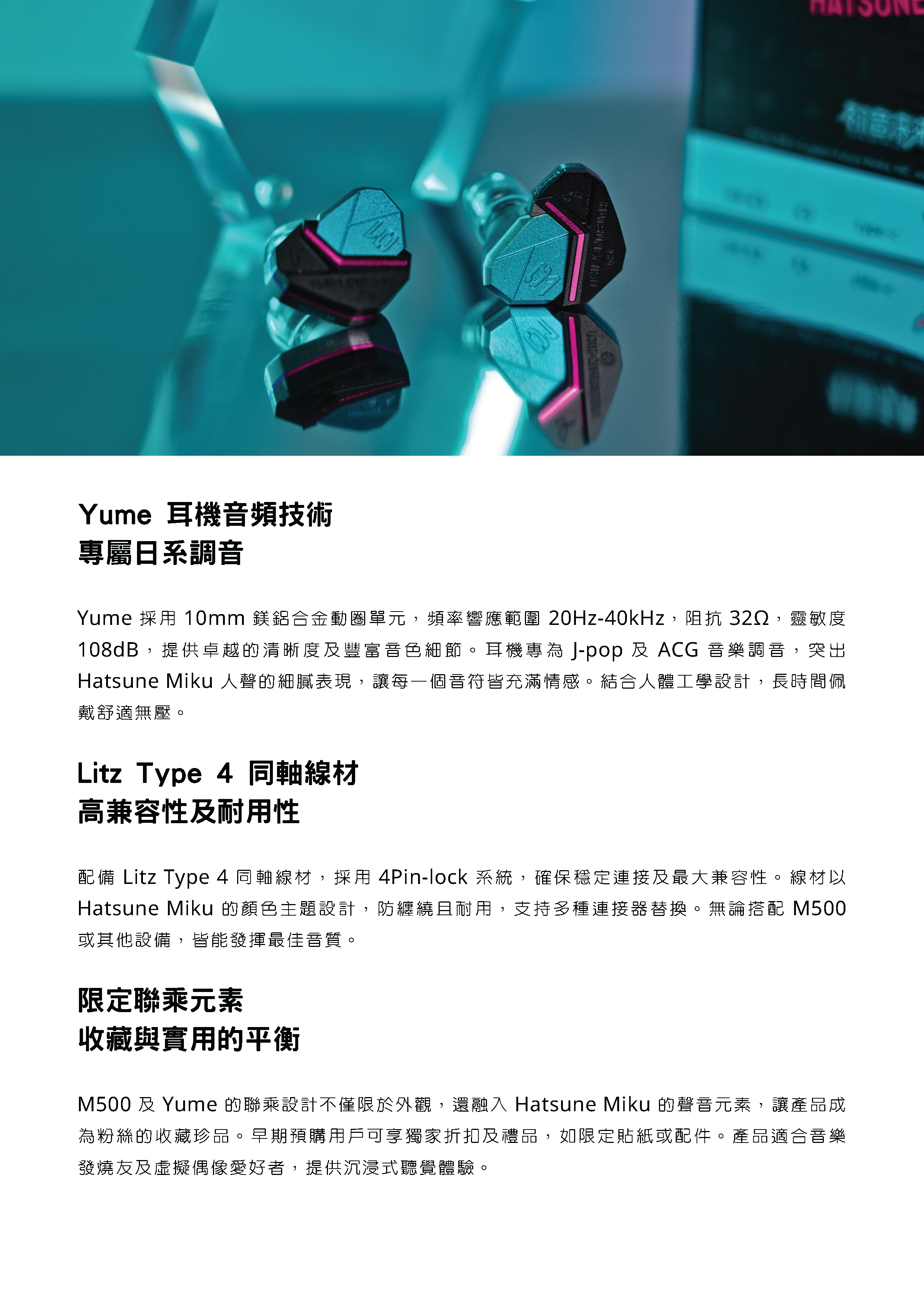 M500 及 Yume 是 HiBy Digital 與 Hatsune Miku 聯乘的限定產品。M500 搭載 雙 CS43198 DAC 及低噪聲運算放 大器, 為全球音樂愛好者及 Hatsune Miku 粉絲帶來沉浸式的 J-pop 及 ACG 音樂體驗。Yume 耳機採用 10mm 鎂鋁 合金動圈單元,完美還原 Hatsune Miku 的標誌性聲音。