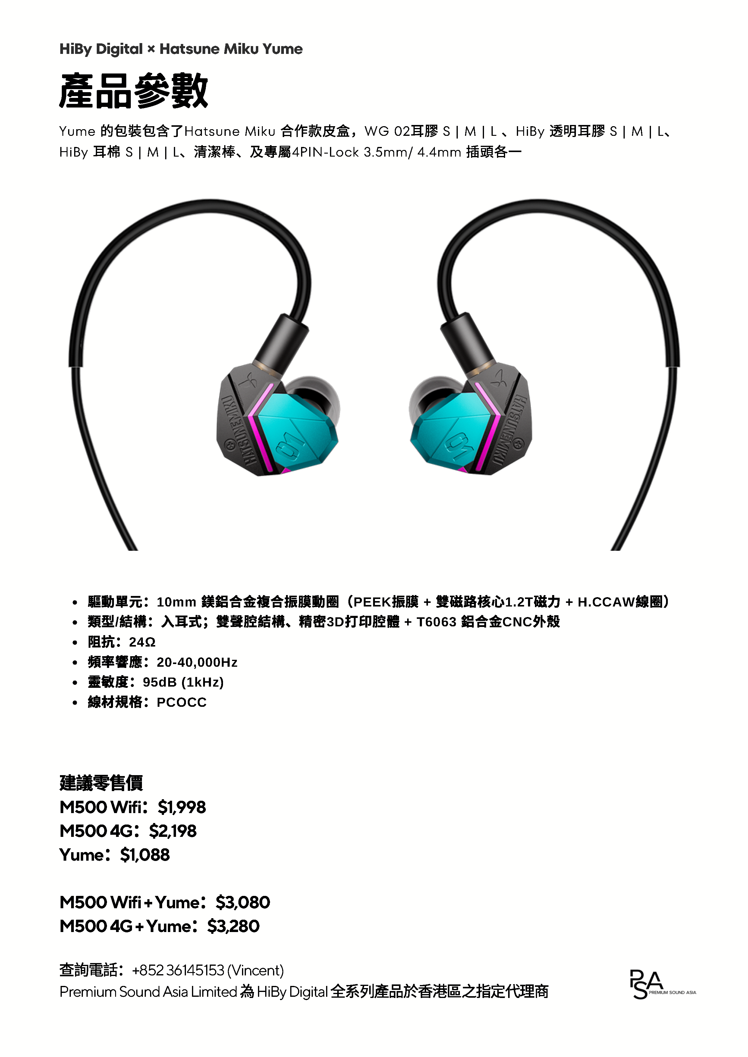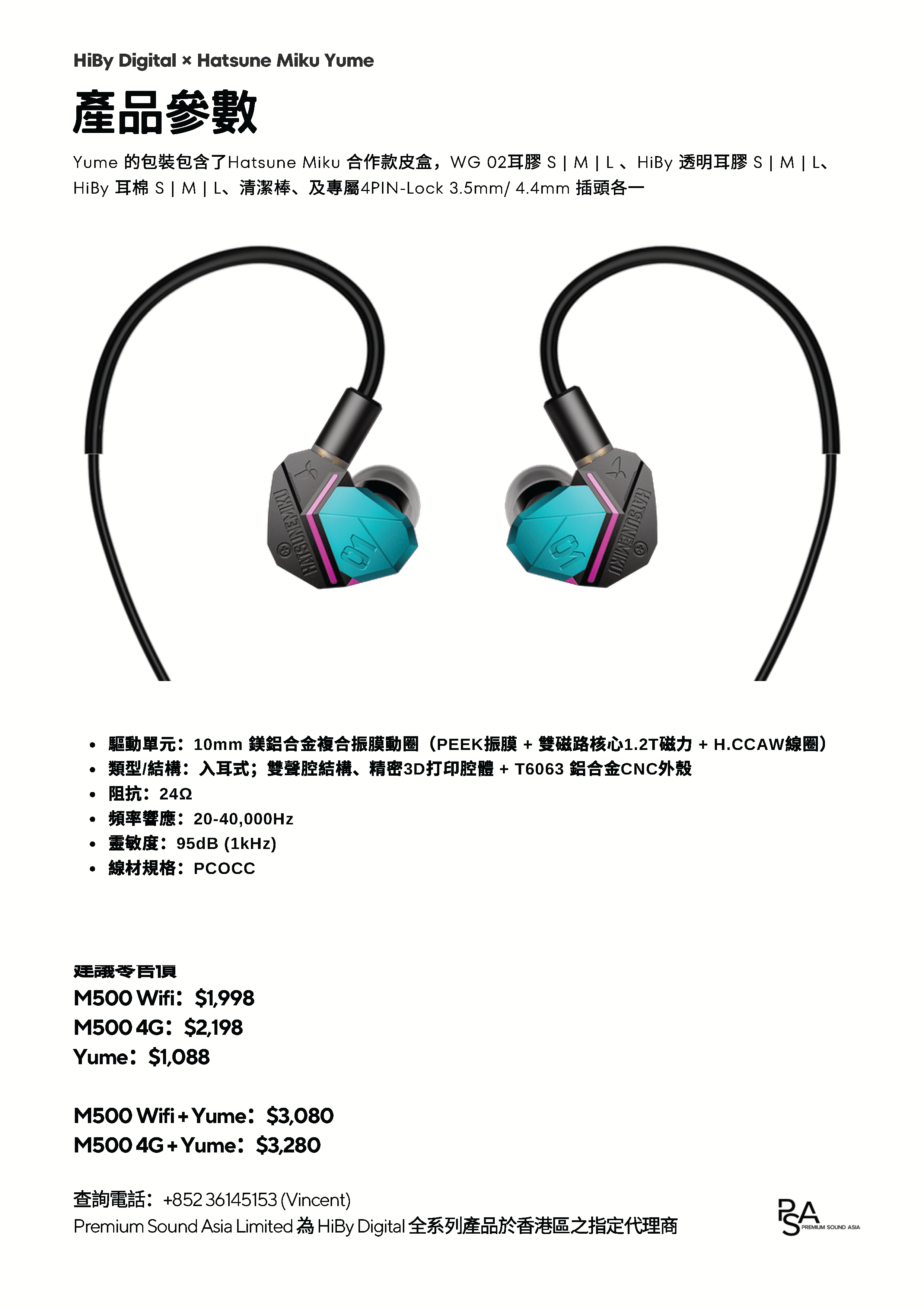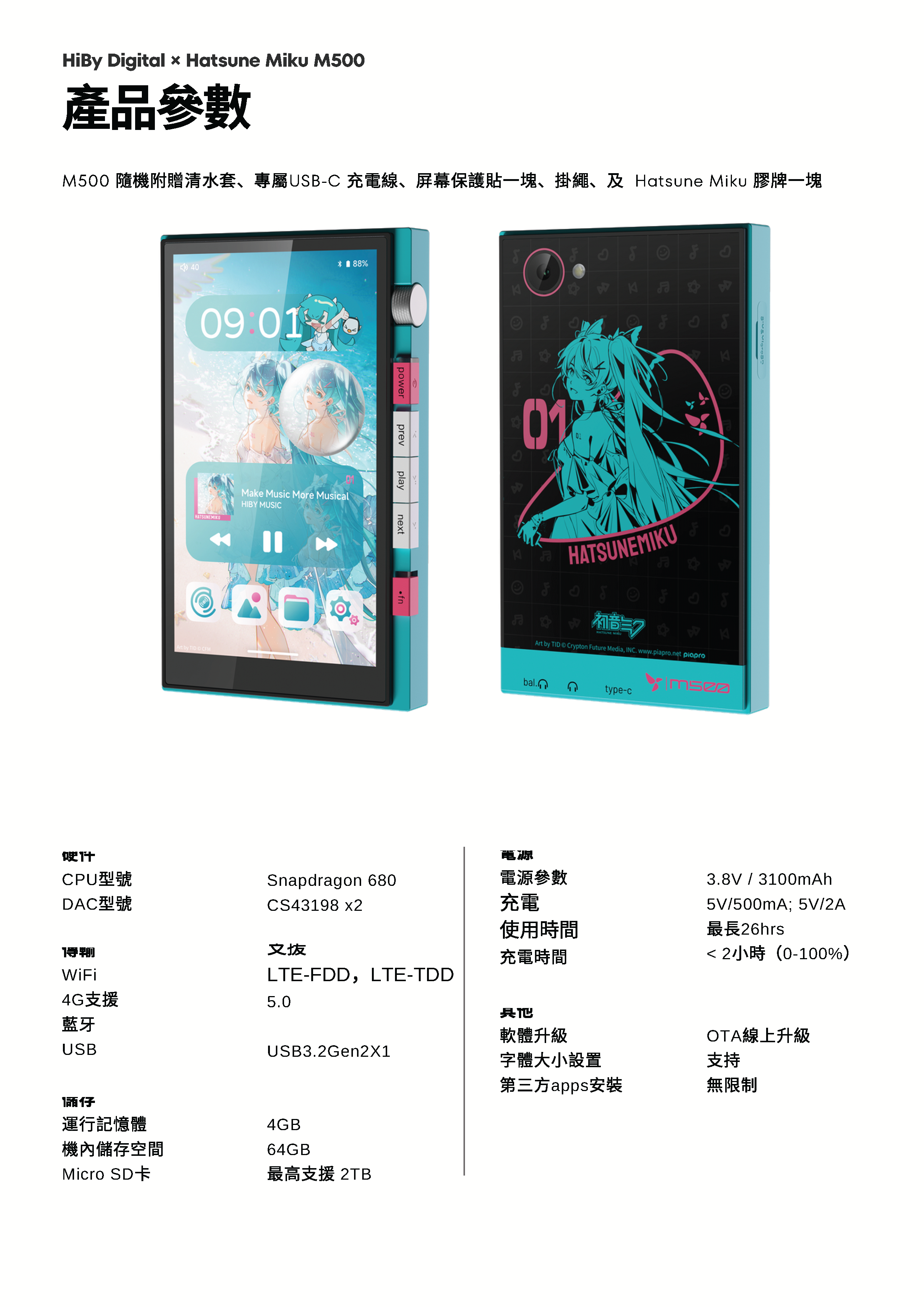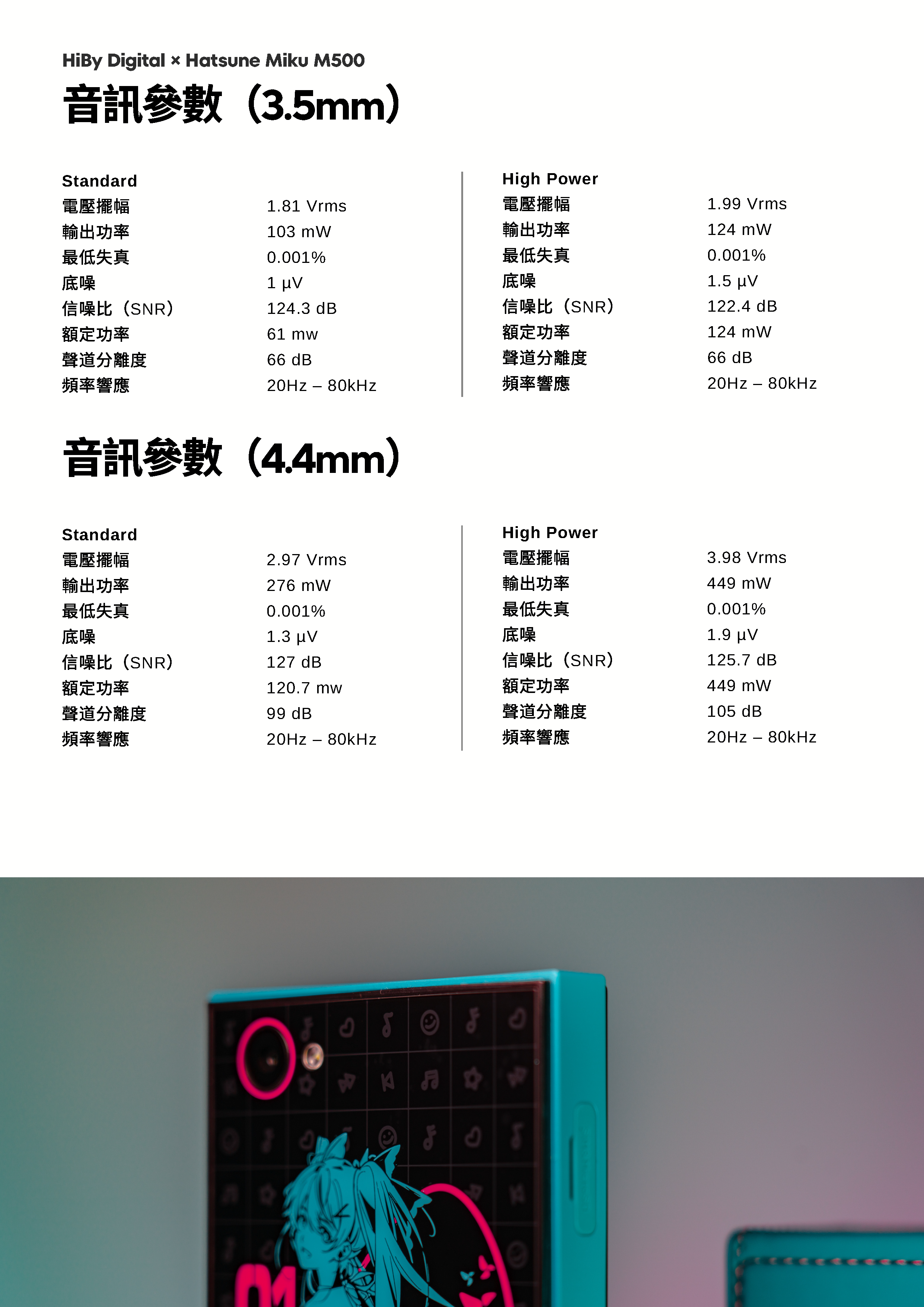 M500 及 Yume 是 HiBy Digital 與 Hatsune Miku 聯乘的限定產品。M500 搭載 雙 CS43198 DAC 及低噪聲運算放 大器, 為全球音樂愛好者及 Hatsune Miku 粉絲帶來沉浸式的 J-pop 及 ACG 音樂體驗。Yume 耳機採用 10mm 鎂鋁 合金動圈單元,完美還原 Hatsune Miku 的標誌性聲音。
