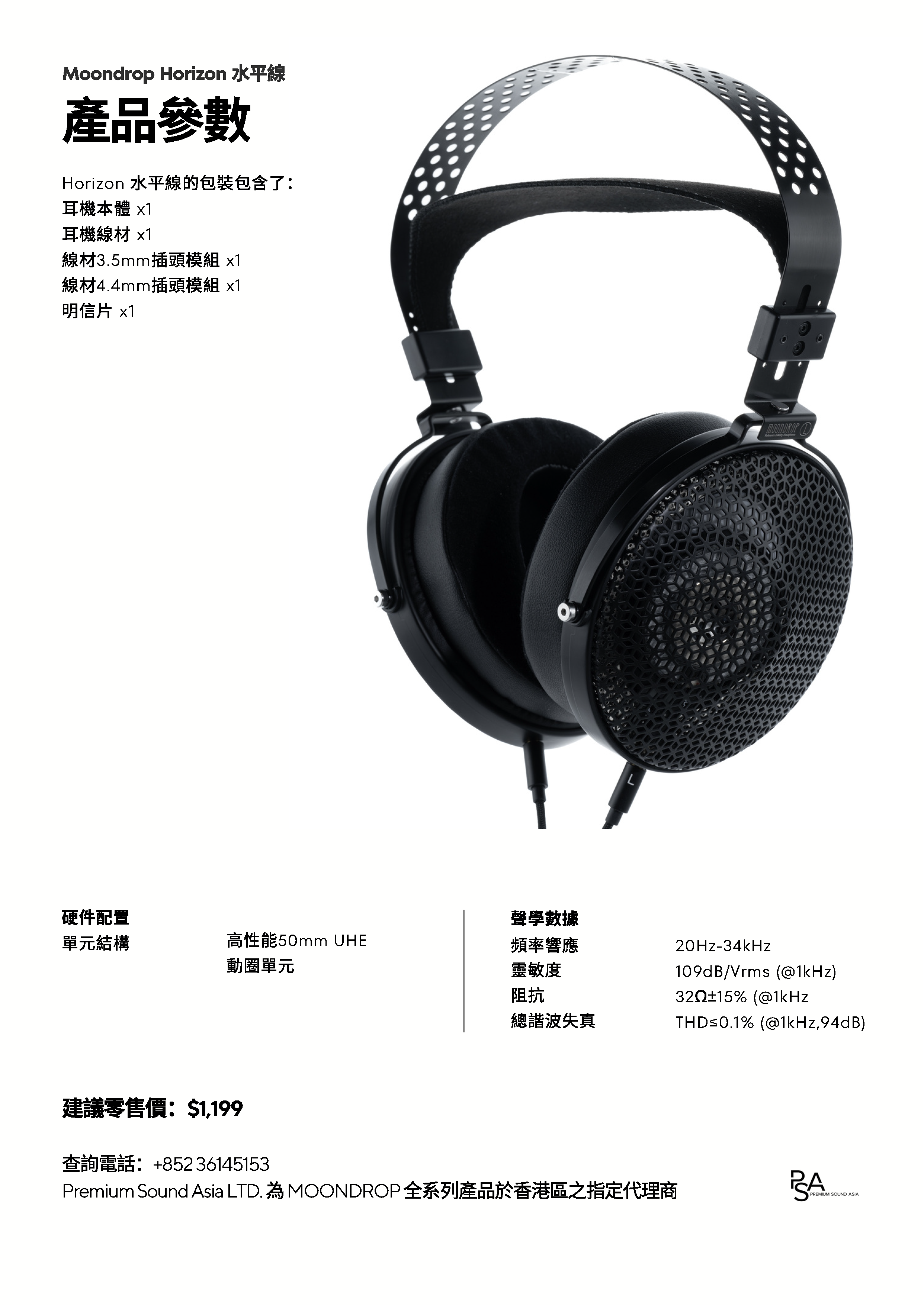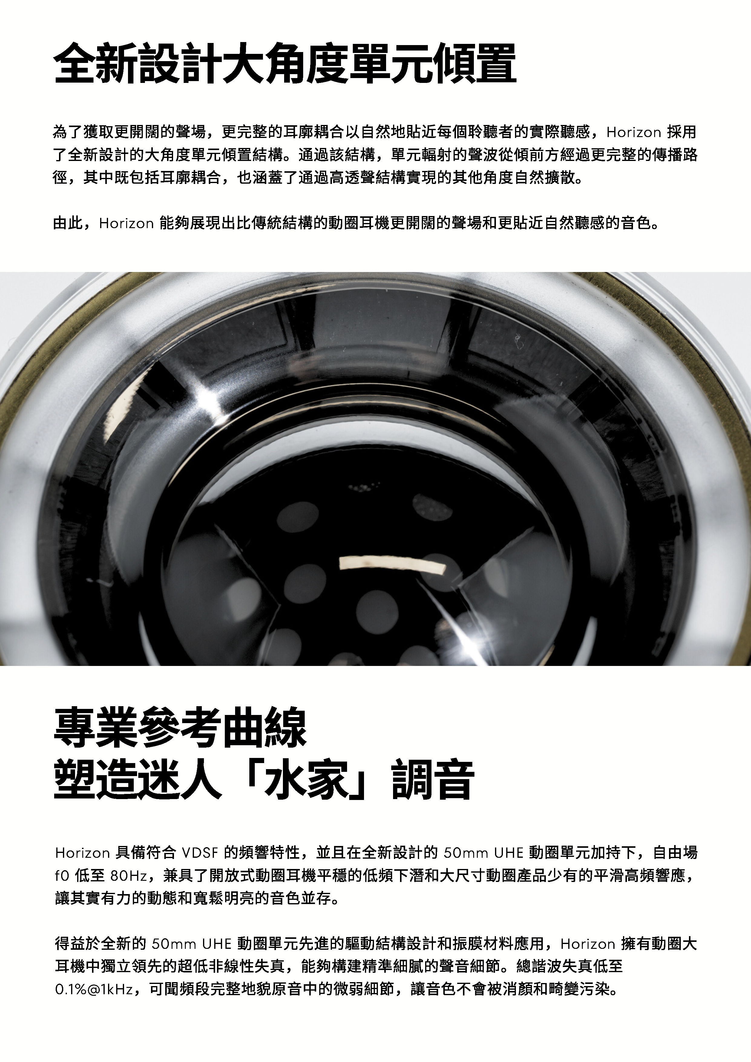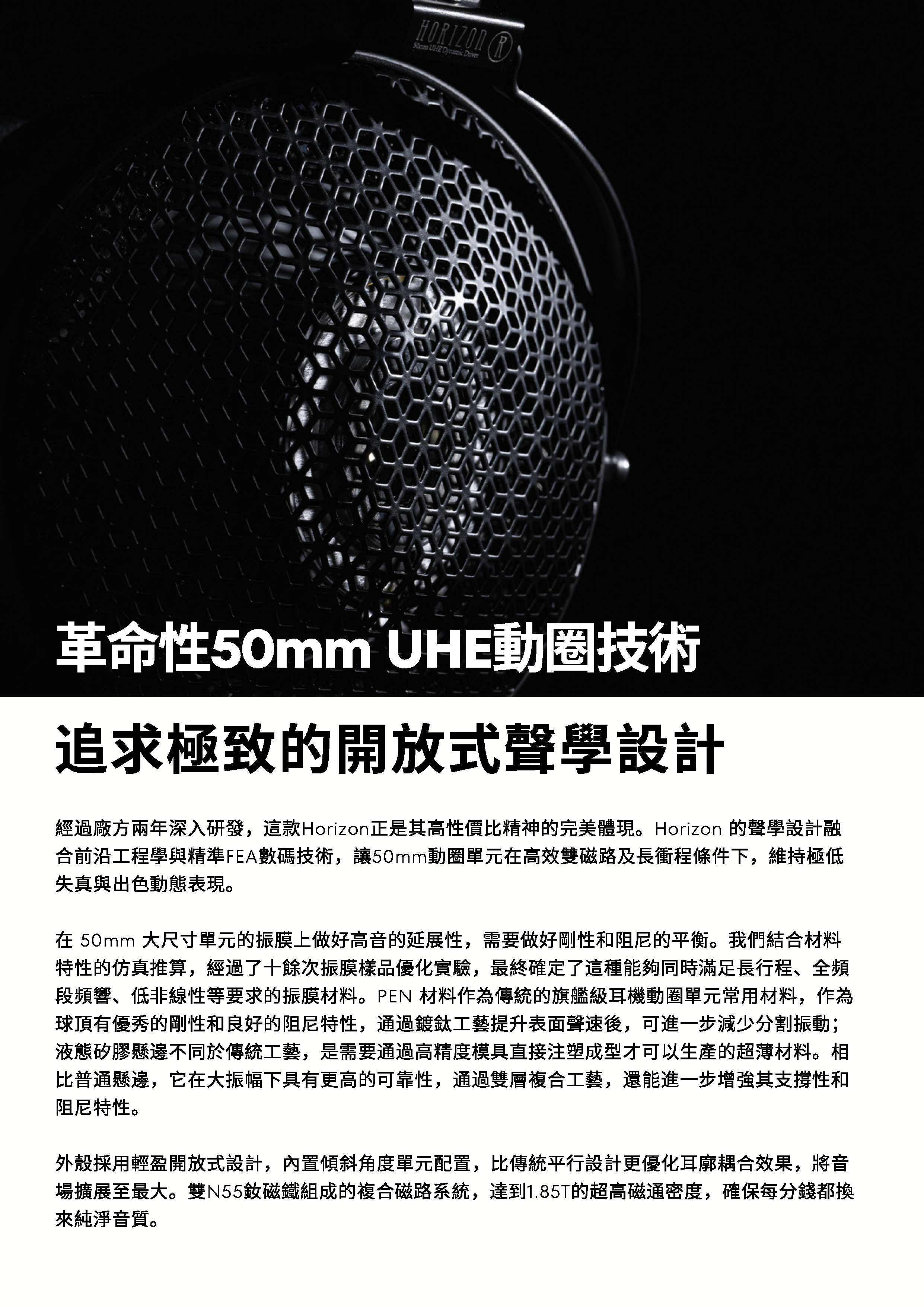 Horizon 地平線是水月雨最新開放式頭戴耳機的革新之作,採用創新50mm UHE超高激勵動圈單元,將高性能動圈單元以獨特傾斜角度置於輕量化框架中,以先進的雙磁路設計及鍍鈦PEN球頂技術強化全頻段表現,令聲音更加開闊、沉浸,帶來前所未有的高性價比體驗。